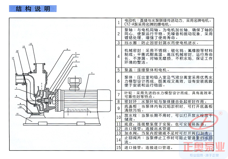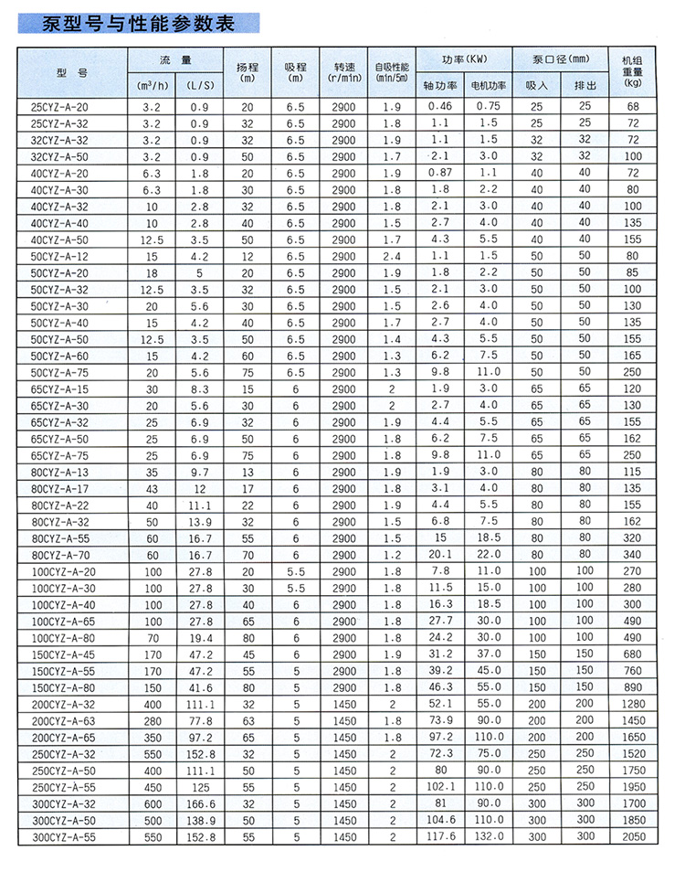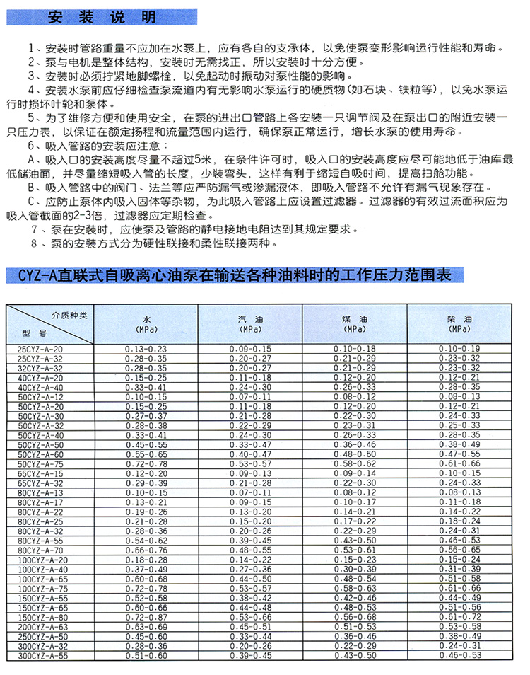 CYZ-A型自吸式離心油泵適用于石油行業、陸地油庫、油罐車的理想產品,并適合于作船用貨油泵、艙底泵、消防泵和壓載泵及機器冷卻水循環等,分別輸送汽油、煤油、柴油、航煤等石油產品和海水、清水,介質溫度-20℃~140℃,如輸送化工液體可改用耐腐蝕機械密封。
