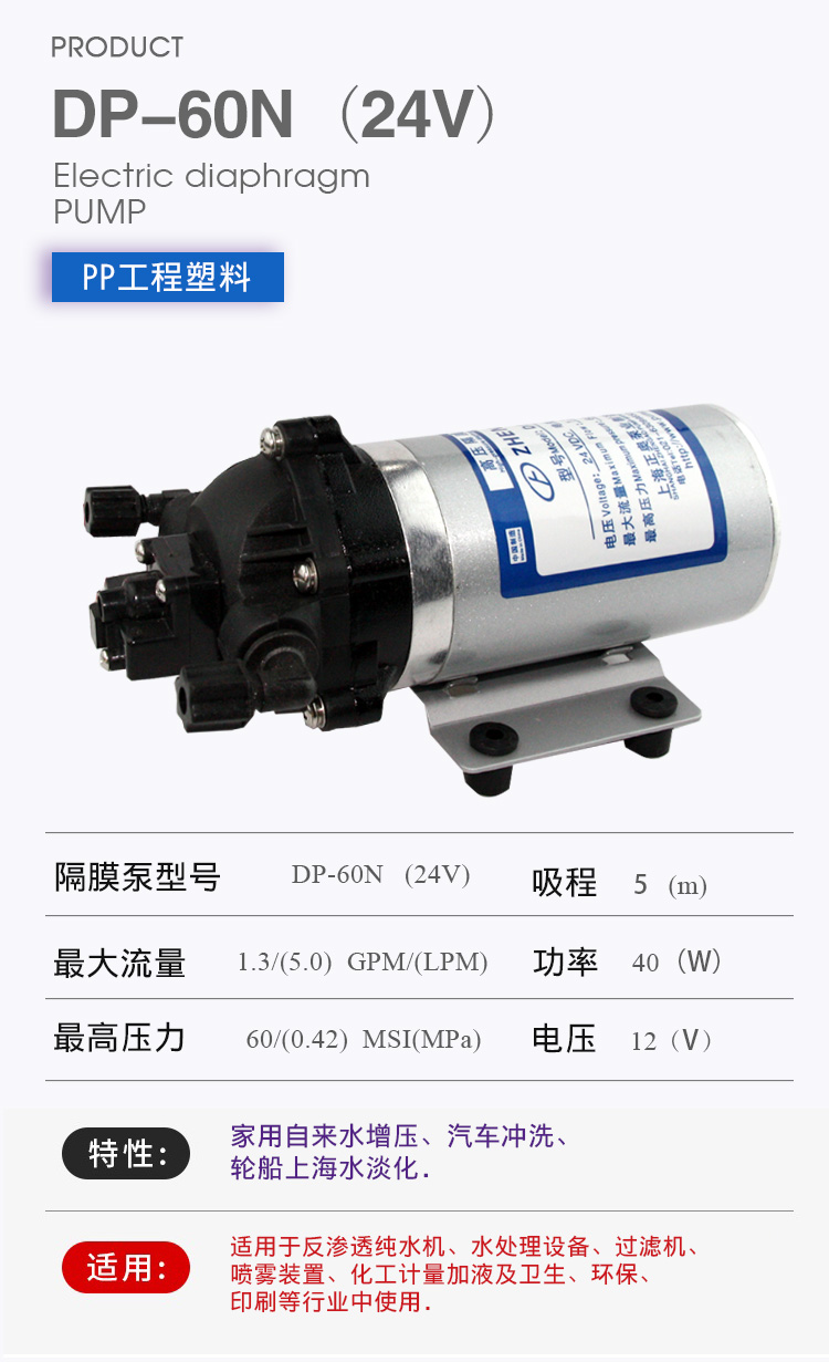 DP微型電動隔膜泵適用于家用自來水增壓、汽車沖洗、輪船上海水淡化,DP隔膜泵適用于反滲透純水機、水處理設備、過濾機、噴霧裝置、化工計量加液及衛生、環保、印刷等行業中使用。
