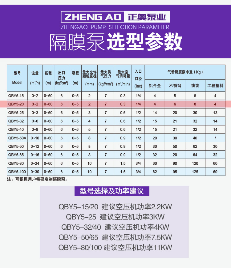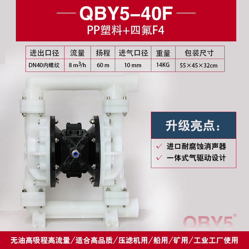 QBY5-F型塑料氣動隔膜泵是目前國內新穎的一種采用壓縮空氣為動力源,通過氣閥往復運動分配空氣,帶動隔膜擠壓輸送介質的容積式泵,該泵集雜質泵、自吸泵、泥漿泵、屏蔽泵、潛水泵等輸送機械的優點。聚丙烯塑料塑料氣動隔膜泵是一種新型輸送機械,是目前國內新穎的一種泵類。采用壓縮空氣為動力源,對于各種腐蝕性液體,帶顆粒的液體,高粘度、易揮發、易燃、劇毒的液體,均能予以抽光吸盡。其性能參數與聯邦德國的WLLDENPVMPS、美國的MARIOWPUMPS相近。 有4種規格直徑:∮10mm(3/8〃)、∮15mm(1/2〃)、∮25 mm(1〃)、∮40mm(11/2〃)。隔膜片根據不同液體介質分別采用丁晴橡膠、氯丁橡膠、聚四氟乙烯、等滿足不同用戶的需要。