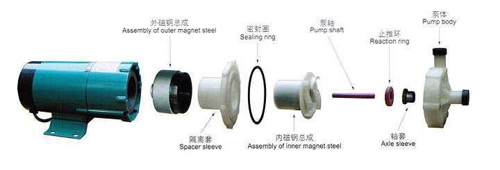 此泵運轉(zhuǎn)是在連軸上和葉輪上分別裝配有磁性材料而互相吸引偶合,無需配以傳統(tǒng)機械軸封,因而是完全密封的。電動機轉(zhuǎn)動扭力是通過主動磁及從動磁的引力帶動葉片工作運轉(zhuǎn)。現(xiàn)今慣用的磁力驅(qū)動泵極大的缺點是在缺液情況下絕對嚴禁運轉(zhuǎn)否則整機將毀壞,給使用者增添不必要的麻煩和煩惱。它采選了一種特別設(shè)計的特配方陶瓷作軸承,具有極強的耐磨性和抗腐蝕性,使其先進性能和質(zhì)量安全得以絕對的保證。