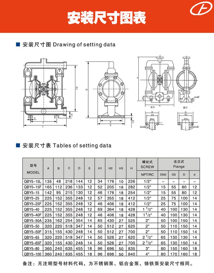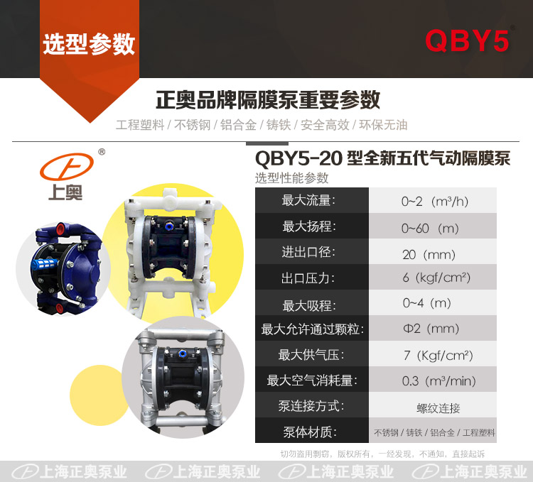 產品名稱:QBY5-20型氣動隔膜泵【全新五代氣動隔膜泵】 如用戶有特殊要求,聯系電話021-66525777,以方便用戶選型,正確使用上海正奧品牌隔膜泵 |