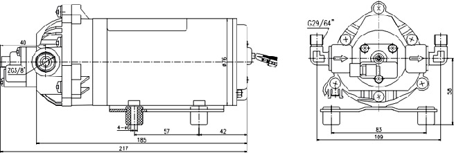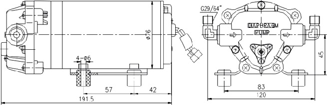 | 型號 | 電壓 (VDC) | 電流 (A) | 流量 GPM/(LPM) | 轉速 (r/min) | 壓力 psi/(MPa) | 吸程 (m) | 調壓開關 (MPa) | 功率 (W) |
