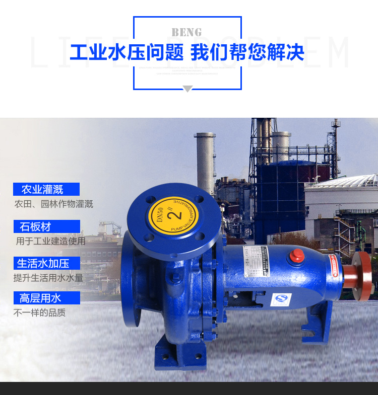 供吸送清水及物理化學性質類似水不含固體顆粒的液體。它廣泛適用于工農業及城市、排水、消防供水等。