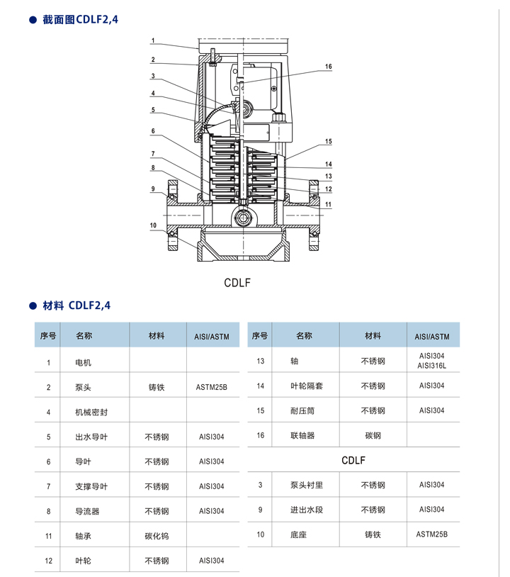 CDLF系列輕型不銹鋼立式多級離心泵(以下簡稱多級泵)是吸取了國內外技術而設計制造的非自吸立式多級離心泵,采用標準立式電機和快裝式機械密封,更換非常方便。 泵的過流部分均采用不銹鋼(304/316)材料制成,可適用于輕度腐蝕性介質。產品投放市場后、質量可靠、使用范圍廣等特點,深受廣大用戶的喜愛。 產品特征: 多級泵輸送介質: