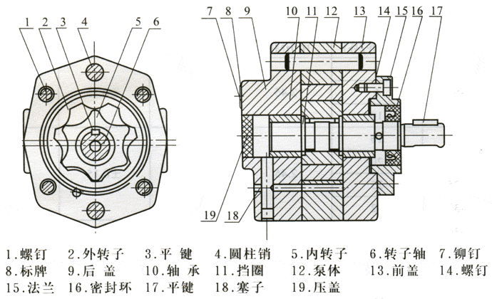 上奧牌BB型BBG型擺線齒輪泵是一種容積式內齒輪泵,其內齒輪(即外轉子)為圓弧齒形,外齒輪(即內轉子)為短幅外擺線的新型齒輪泵。由于該泵結構簡單、噪音低、輸油平穩(wěn)、自吸性能好的高轉速特性,因而在低壓液壓系統(tǒng)中被廣泛采用,可作為動力泵或潤滑泵各冷卻泵,本泵適用于輸送各種油類。目前該泵正在逐步取代CB型、KCB型2CY型齒輪油泵。
