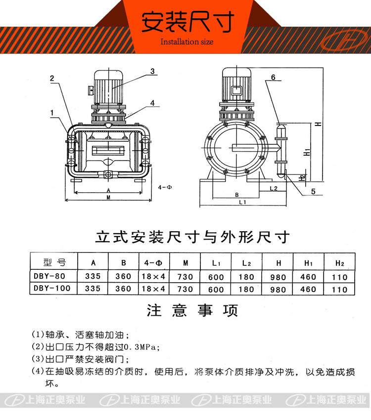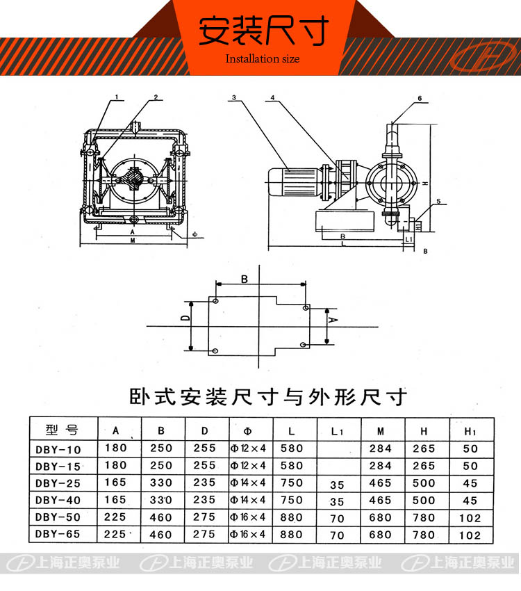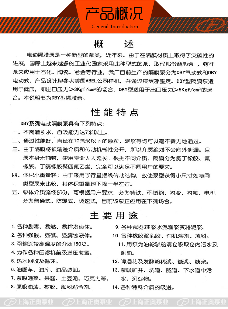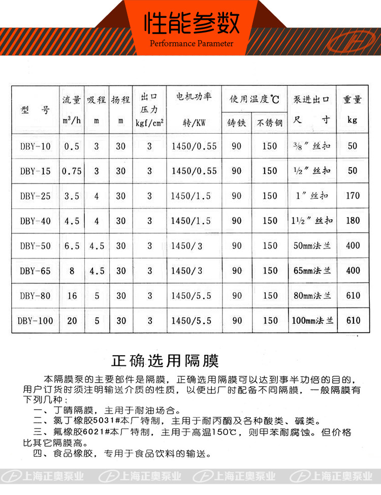 DBY系列電動隔膜泵是一種新型的泵類。本泵應用于石化、陶瓷、冶金等行業,這種泵的主要特點是不需灌引水。直徑在10毫米以下的顆粒、泥漿等均可以毫不費力地通過。由于隔膜將被輸送介質和傳動機械件分開,所以介質絕對不會向外泄漏,且泵本身無軸封,使用壽命大大延長。根據不同介質,隔膜分為氯醇橡膠、氟橡膠、丁晴橡膠等,完全可以滿足不同用戶的要求。