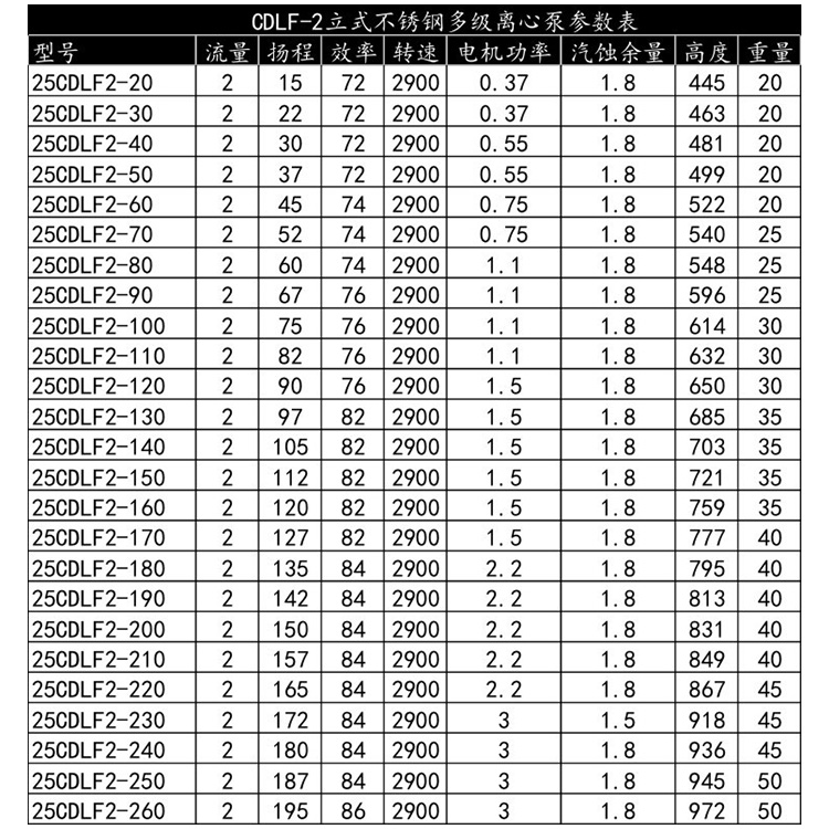 CDLF-2不銹鋼立式多級泵性能參數選型: