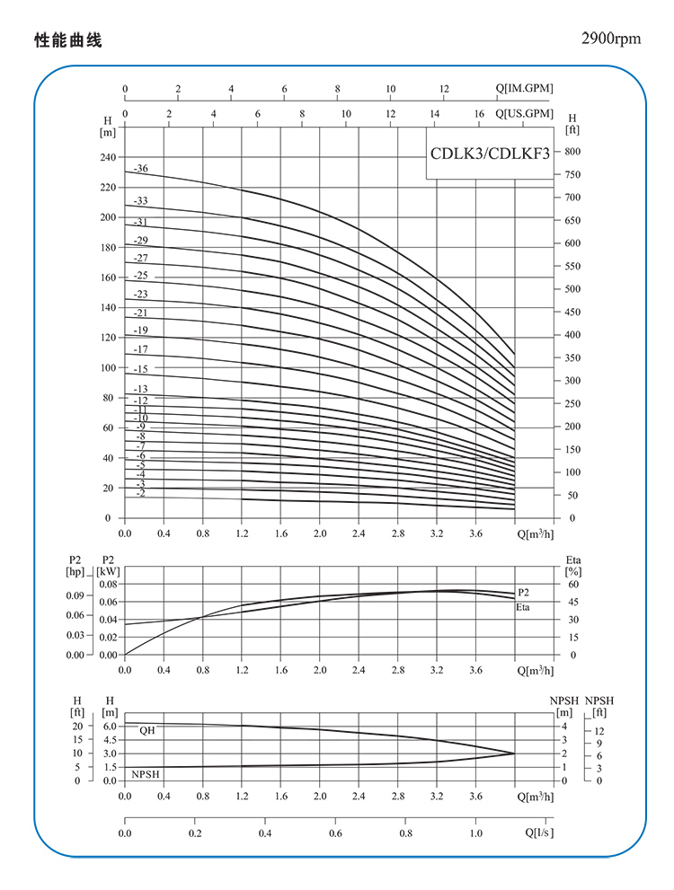 4.泵的使用參照加粗線的性能范圍,以防流量過量水產生過熱和流量過大使電機過載等。