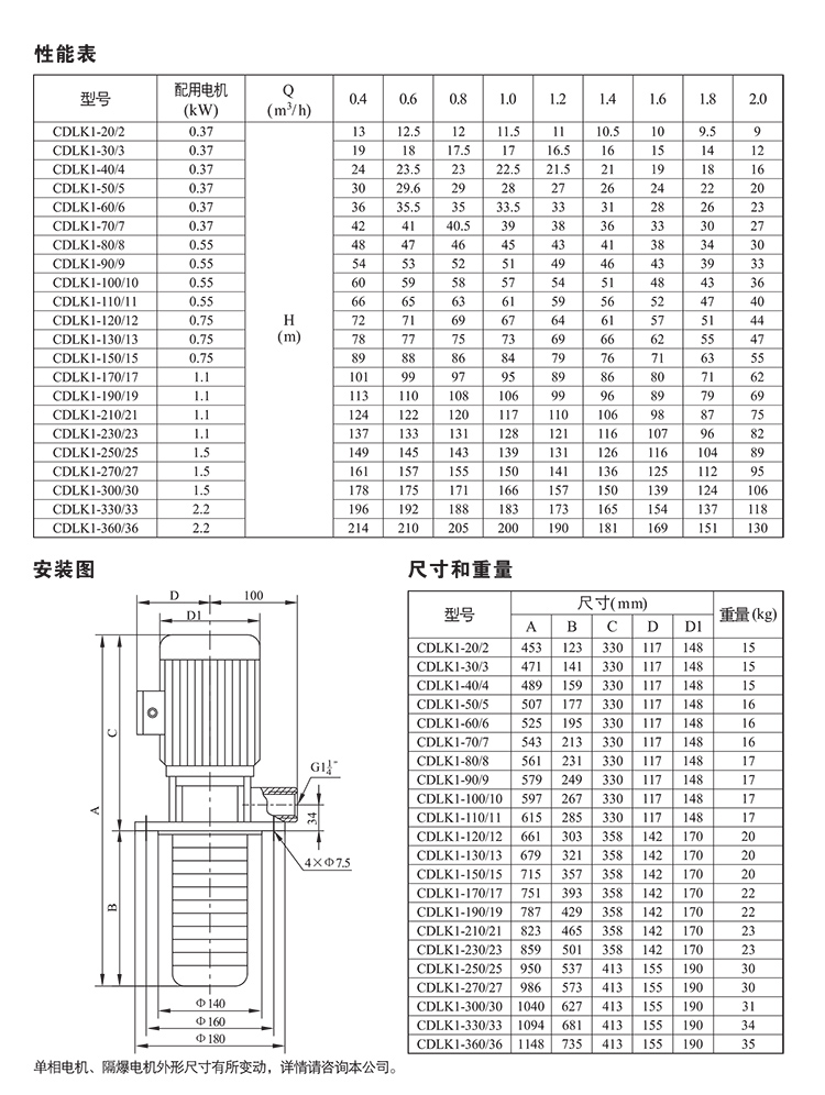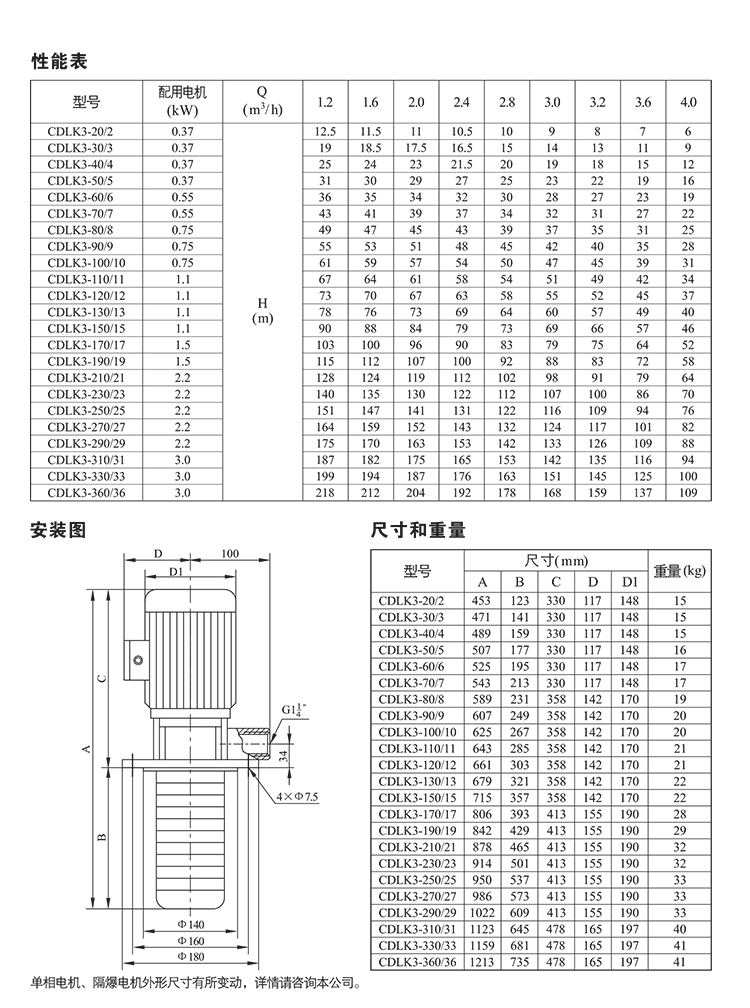 CDLK/CDLKF為安裝標準電機的自吸立式多級離心液下泵,電機軸通過泵頭用聯軸器直接與泵軸聯接,泵可根據需要配置智能保護器,對泵干轉、缺相、過載等進行有效保護。為滿足水槽或容器的安裝深度,可安裝空腔體來改變泵本身的長度,不同的級數長度見尺寸和重量表和可供產品范圍表。