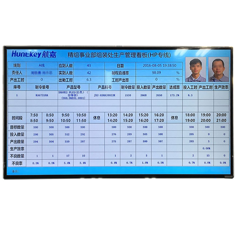 液晶電子看板,采用高分辨率,顯示內(nèi)容豐富,色彩和布局可根據(jù)客戶喜好進行設(shè)計,同時可通過以太網(wǎng)/無線網(wǎng)絡(luò)將工廠內(nèi)的所有電子看板進行集中管理,并且將實時的生產(chǎn)數(shù)據(jù)上傳到服務(wù)器,管理人員在辦公室就可以實時查看生產(chǎn)進度,返修率等數(shù)據(jù)。